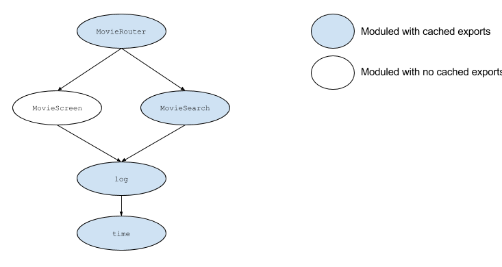 If the user accesses the movies' search view but not the other one, all the modules except for MovieScreen would have cached exports. If a change is made to module time, the runtime will have to clear the exports of log for it to pick up time's changes. The process wouldn't finish there: the runtime will repeat this process recursively up until all the parents have been accepted. So, it'll grab the modules that depend on log and try to accept them. For MovieScreen it can bail, as it hasn't been required yet. For MovieSearch, it will have to clear its exports and process its parents recursively. Finally, it will do the same thing for MovieRouter and finish there as no modules depends on it.